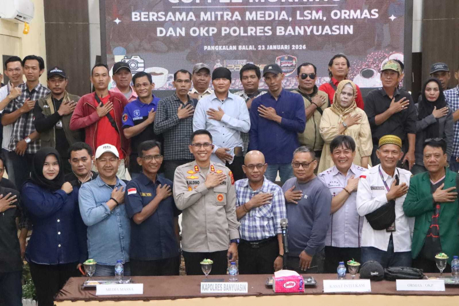 Trabaznews.com, Banyuasin – Polres Banyuasin menggelar kegiatan Coffee Morning bersama mitra media, Lembaga Swadaya Masyarakat (LSM), organisasi kemasyarakatan (Ormas), serta Organisasi Kepemudaan (OKP), sebagai wadah dialog terbuka dan penguatan sinergi dalam menjaga keamanan dan ketertiban masyarakat (kamtibmas), jumat (23/01/2026).