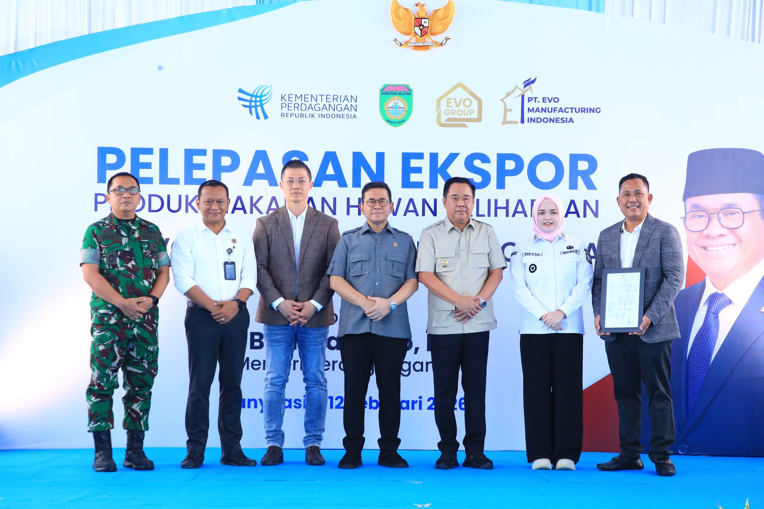 Trabaznews.com, BANYUASIN — Menteri Perdagangan RI Dr. Budi Santoso, M.Si., bersama Wakil Gubernur Sumatera Selatan (Sumsel) H. Cik Ujang melepas ekspor perdana produk makanan hewan peliharaan ke Filipina dari pabrik PT Evo Manufacturing Indonesia (EMI) di Desa Karang Anyar, Sumber Telang, Banyuasin, Kamis (12/2/2026).