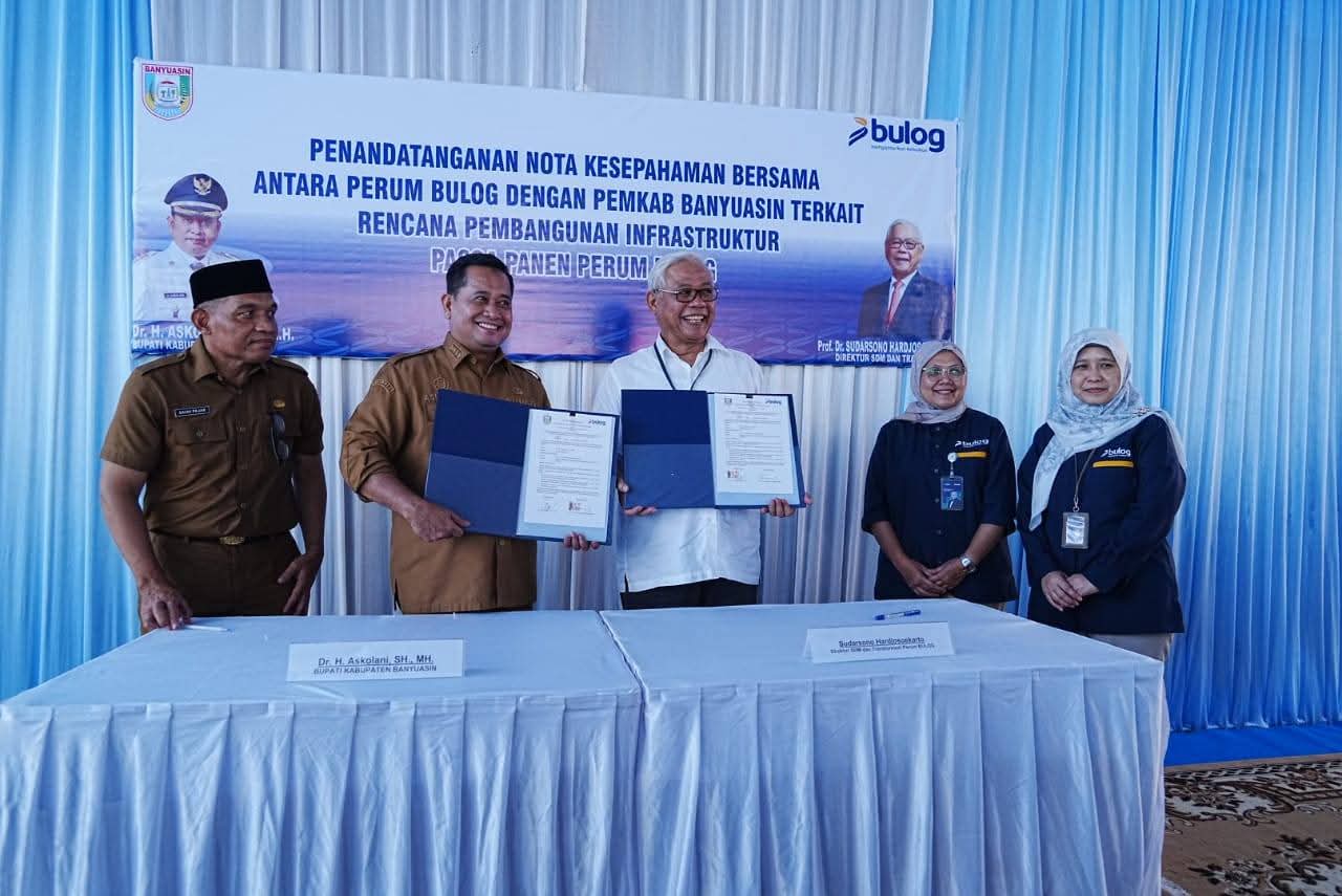 Trabaznews.com, Palembang- Dalam rangka terus memperkuat Ketahanan Pangan di Kabupaten Banyuasin, Bupati Banyuasin, Dr. H. Askolani, SH., MH menandatangani Memorandum of Understanding (MoU) dengan Perusahaan Umum (Perum) Bulog Kenten Palembang tentang Hibah Tanah untuk pembangunan Infrastruktur Pasca Panen Perum Bulog di Kabupaten Banyuasin berlangsung di Gudang Bulog Kenten Sukamaju, Kota Palembang pada Selasa (24/02/2026).